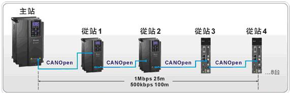 以往的變頻器是扮演純粹驅動的角色,接收上位機的命令做各種機械運動,C2000內建的PLC功能,同時支援CANopen通訊機能,當客戶有做兩臺以上變頻器的應用時,只需要透過一臺C2000做主站,就可以實現最多同時/控制8臺C2000或ASDA-A2伺服的應用,還可以利用分散式I/O的方式來控制遠程I/O節點,增加主機 I/O。