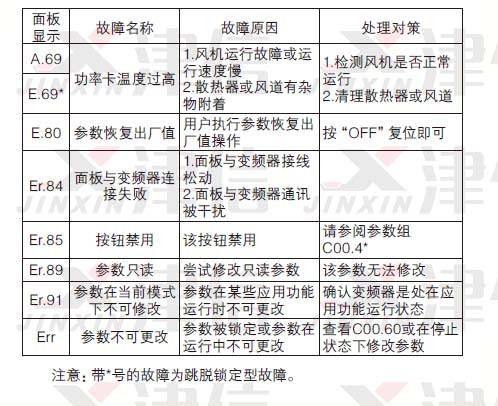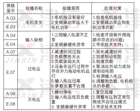 故障說明變頻器由于某種原因已經超過設計極限,故障發生后變頻器跳脫,必須復位才能重新運行。故障產生時,面板顯示“E.XX”(XX指數字)。