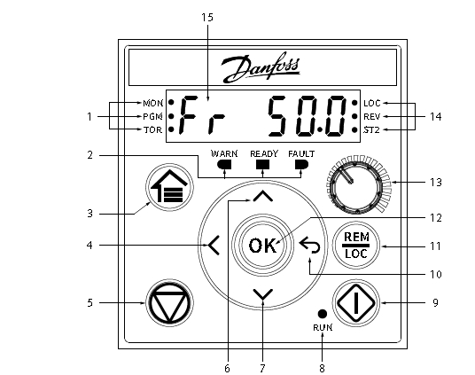 | 1 狀態(tài)指示燈 | 6 向上 | 11 遠程/本地 |