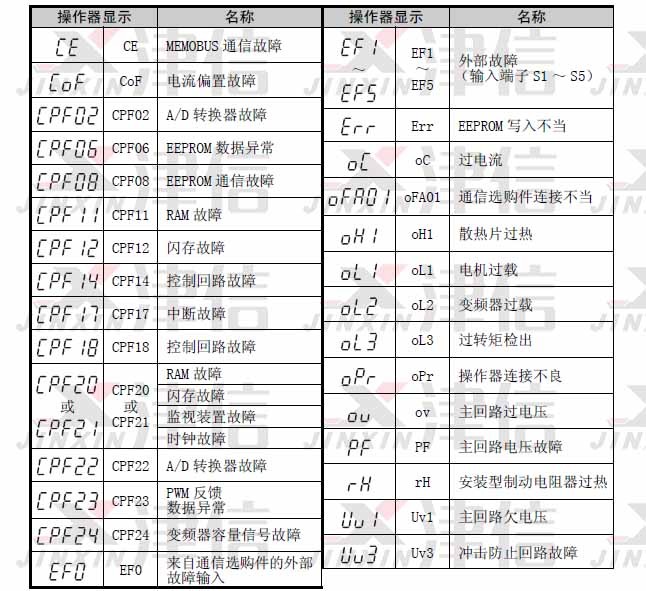安川變頻器在出現故障代碼時,一共有三種表現形式: